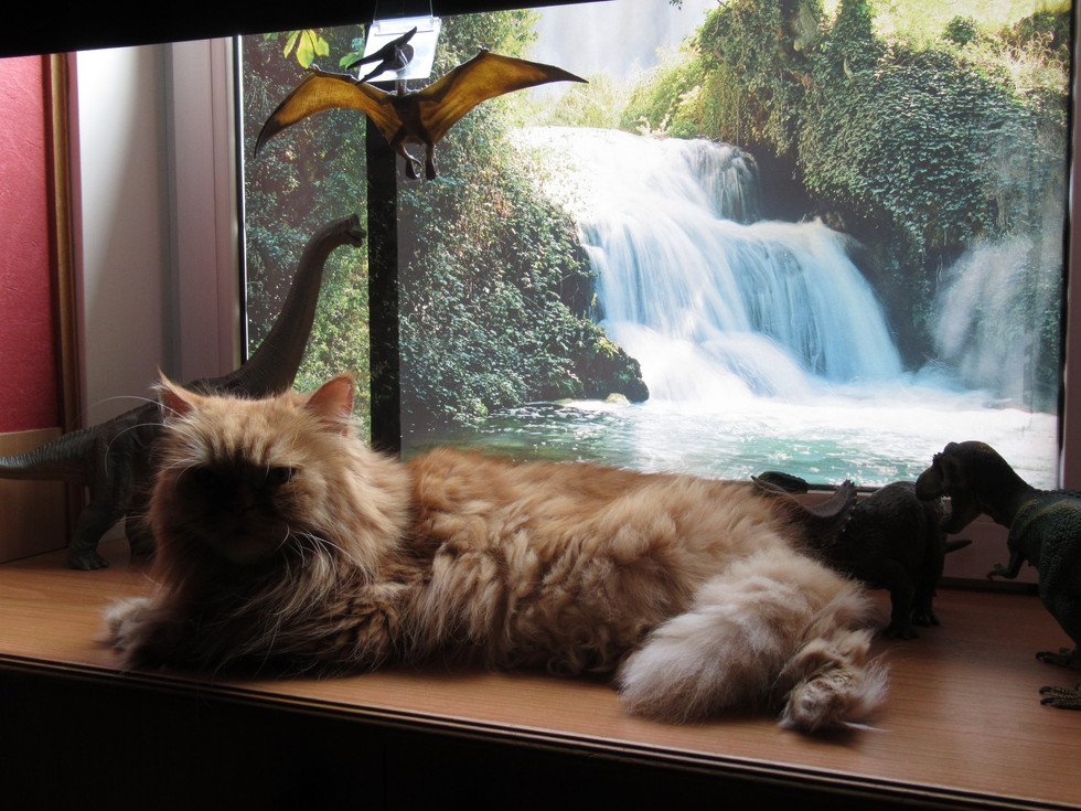 Gesagt, getan. Ein entsprechendes Poster mit Wasserfall und Grünzeug hatten wir noch zu Hause. Keine Ahnung, wann Paps das besorgt hat, ist aber sicher schon an die 5 Jahre oder länger her. Jedenfalls, da es sonst eh nur ungenutzt im Kasten rumstehen würde wurde das gute Stück zerschnitten, angepasst und letztlich aufs Fenster geklebt. Einerseits scheint somit nicht die Sonne derart extrem rein. Andererseits hat es einen genialen Effekt und die Dinos einen schönen Platz mit Pinky dazwischen.